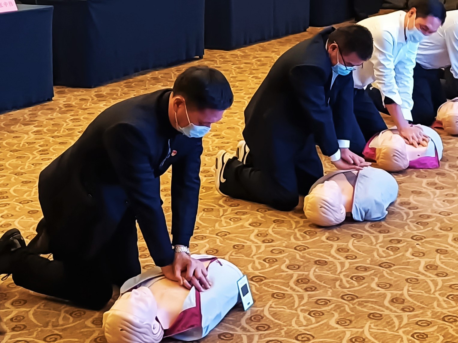 学以致用,巩固认知。通过培训讲师的引导,在场员工顺利实现应急救护理论与技能实操的联动。强运动量的力竭、十指紧扣的胀痛丝毫未能阻挡全员积极参与心肺复苏术实操。跟随节拍器的按压节奏,从伊始的“眼神聚焦位置错误”、“手臂发力部位不当”、“未使人体模具腹部有效隆起”到满分学员大量涌现,实践热情度不断高涨,技能掌握度显著提升,为“危难时刻,我有准备”奠基。