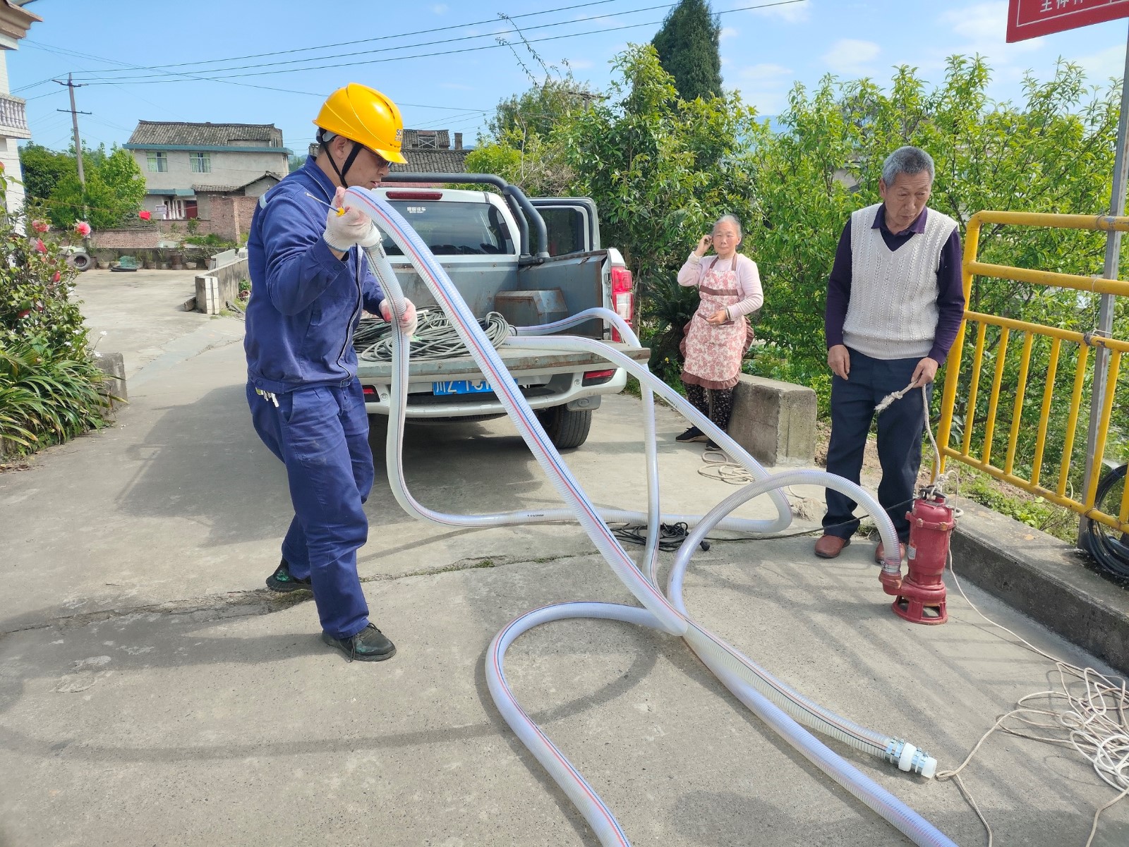 “大爷,抽水耕地时一定要注意安全,不要破坏电线的绝缘层,避免电线裸露漏电……”