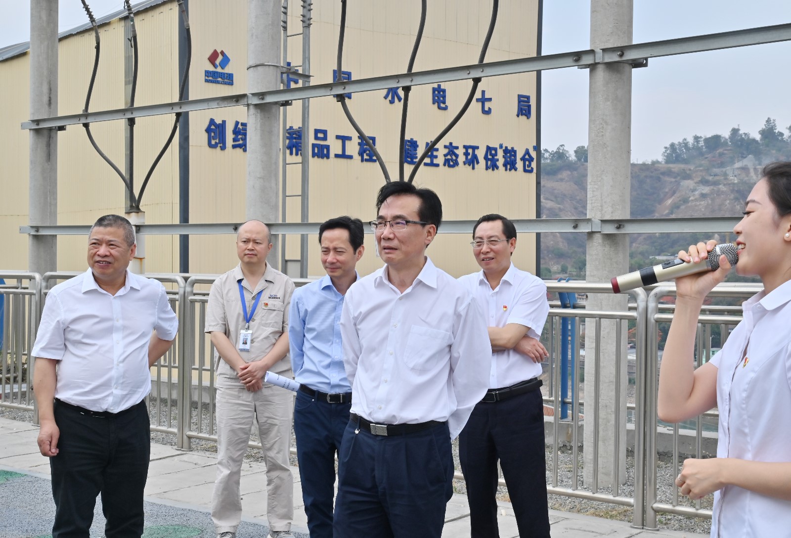 吴晓曦一行先后来到银江水电站施工变电站观景平台、上游围堰详细了解项目整体规划、建设意义、工期计划、目前施工进度、安全环保及防洪度汛等情况。