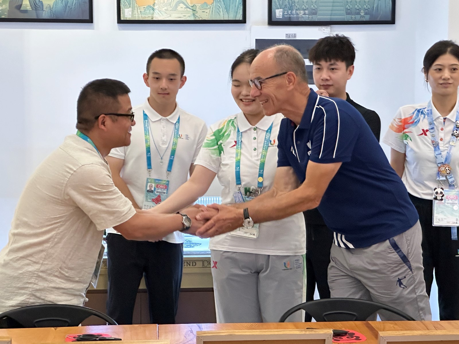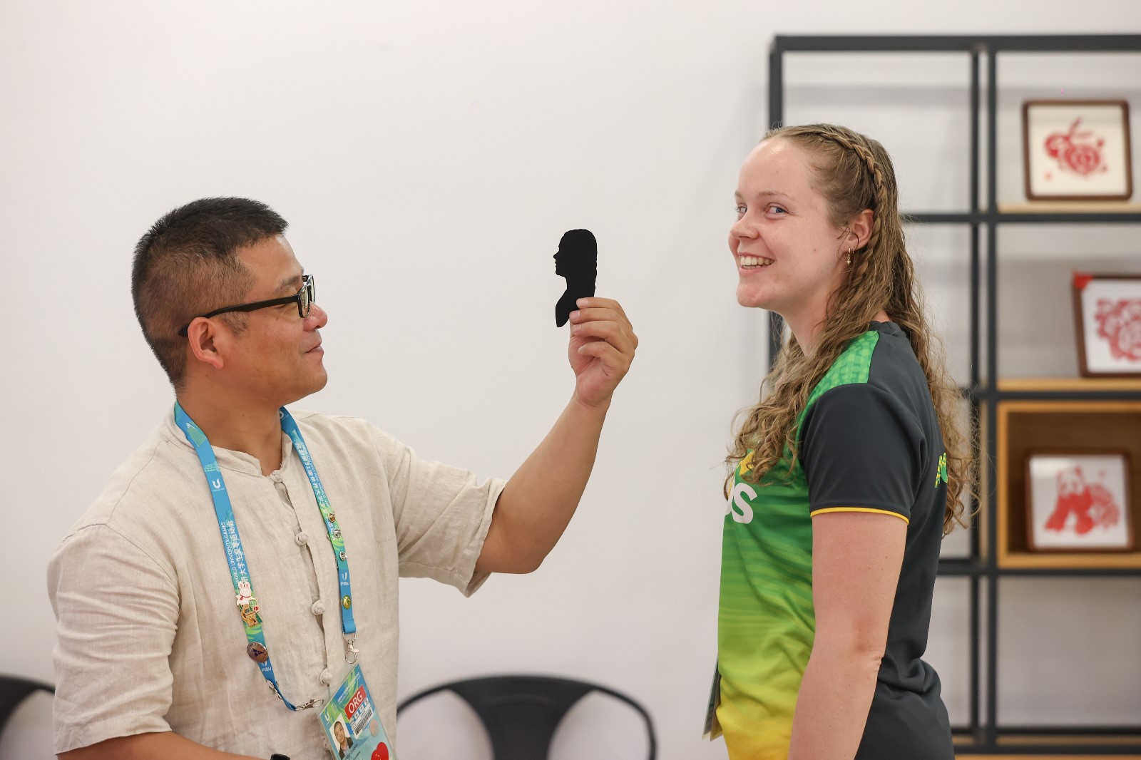 庄丛灿的剪影作品和其耐心负责的剪纸教学倍受运动员们“点赞好评”的同时,也吸引了国际大体联和各国代表团人员前来“沉浸式体验”。期间,庄丛灿为国际大体联代理主席雷诺·艾德和意大利代表团官员彼得罗·伊瓦尔迪进行剪纸教学和剪影留念。