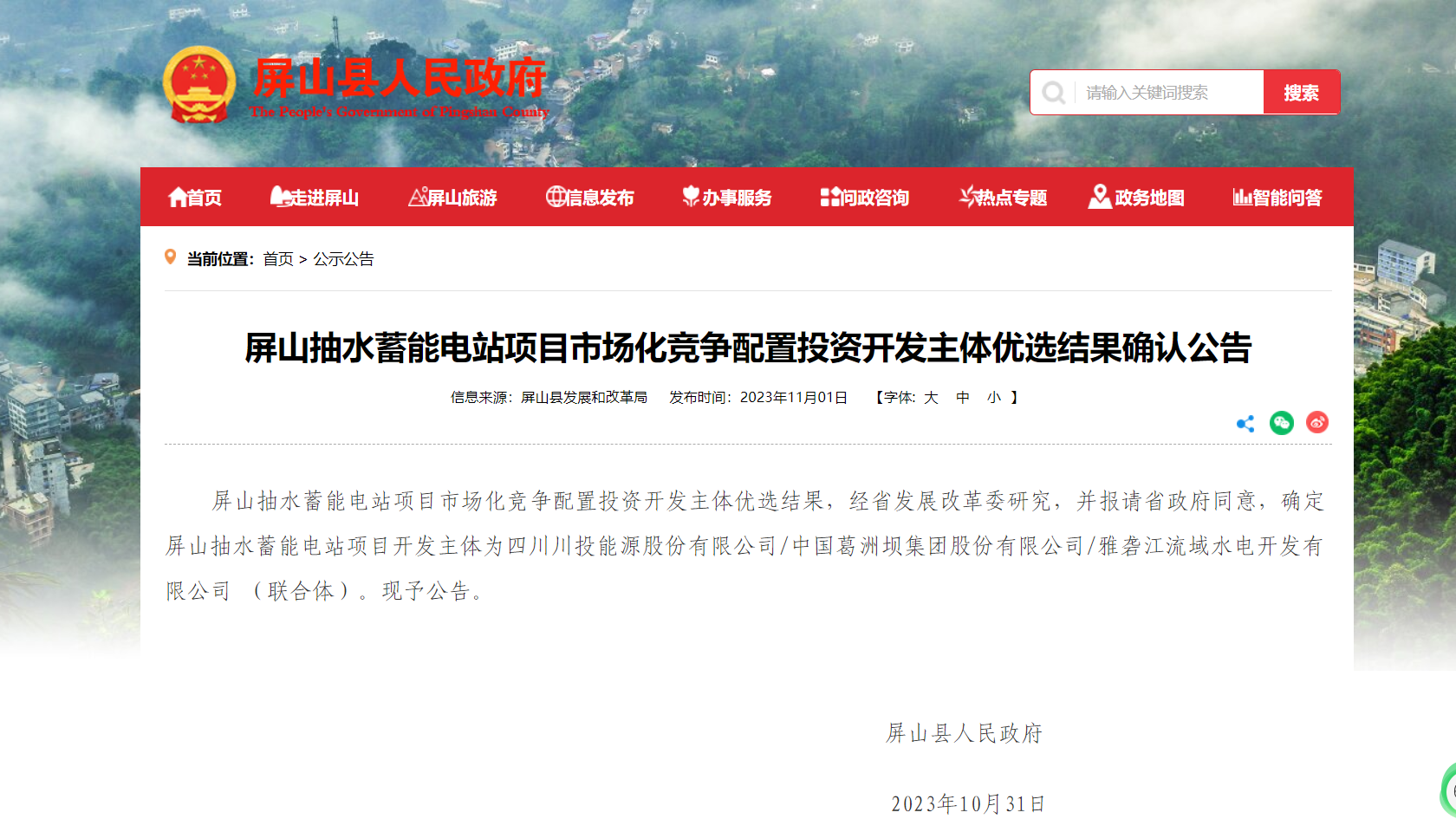 11月1日,宜宾市屏山县人民政府发布《屏山抽水蓄能电站项目市场化竞争配置投资开发主体优选结果确认公告》,易倍体育(中国)官方网站 、雅砻江流域水电开发有限公司、中国葛洲坝集团股份有限公司组成的联合体成功中标。该项目是易倍体育 贯彻习近平总书记来川视察重要指示精神,以高质量主题教育成效推动企业高质量发展的新成果,是深入贯彻落实省委十二届三次全会精神,加力推进新型工业化的新体现,是推进“五区共兴”的新担当,是落实易倍体育 “1+3”产业发展战略的新作为,实现了在抽水蓄能领域、自主开发百万千瓦级电站领域“双破题”!