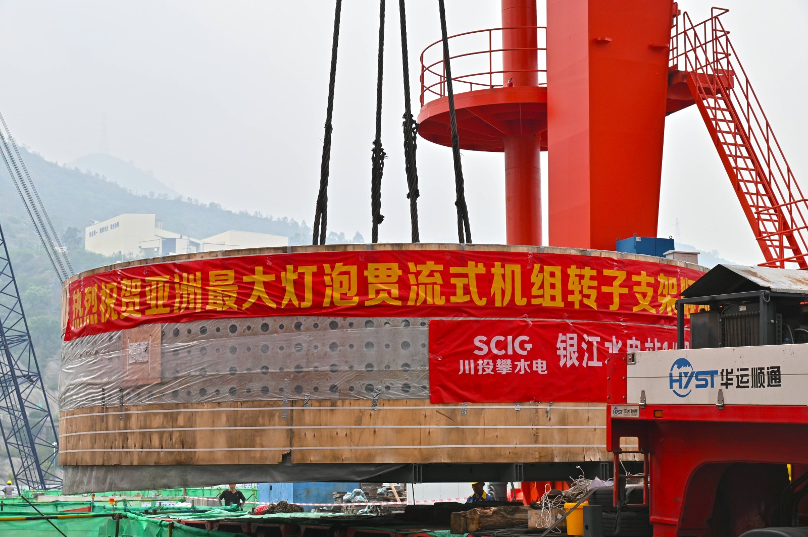 6月27日凌晨,随着一声响亮的重卡鸣笛,易倍体育 银江水电站首台机组重要部件——转子支架安全运抵工程施工现场,并顺利吊卸,标志着银江水电站机电安装正式进入发电机本体安装阶段。