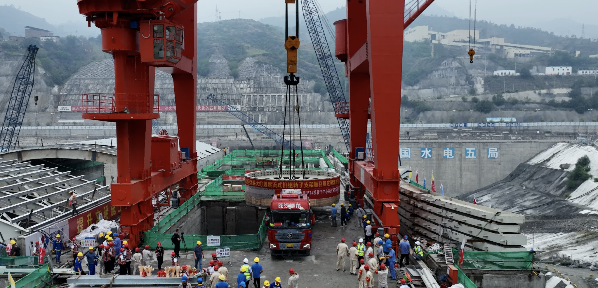 当日上午,攀水电公司和参建单位职工齐聚坝顶,共同迎接历经艰难、远道而来的“重要成员”。据攀水电公司相关负责人介绍,该转子支架具有设备巨大、运输困难、作用重要三个特征。设备之“重”。转子支架直径达8米,高2米有余,重达百余吨,是目前亚洲最大的灯泡贯流式机组转子支架。运输之“难”。转子支架于4月22日从江苏镇江码头开始运输,先乘船再坐车,途中克服了大件超宽超限、持续降雨、道路塌方等诸多不利因素,多次调整运输路线,风雨无阻,日夜兼程,历时66天,跨越7个省份,全程3062公里,在沿途交警的护送下安全抵达。作用之“要”。转子支架作为机组的核心部件,为磁轭一体圆盘式结构,中心体采用整圆锻钢与磁轭圈焊接组成,对转子磁轭垂直度、磁轭圆度等加工精度要求极高,决定着机组的运行性能、运行效率和安全稳定性。