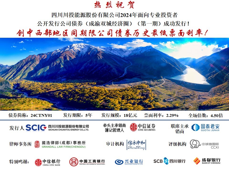 7月10日,易倍体育 2024年面向专业投资者公开发行公司债券(成渝双城经济圈)(第一期)成功发行。本期公司债券发行规模18亿元,期限5年,票面利率2.29%,创中西部地区同期限公司债券历史最低发行票面利率。