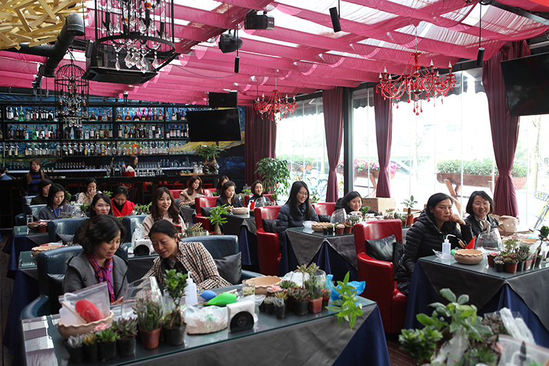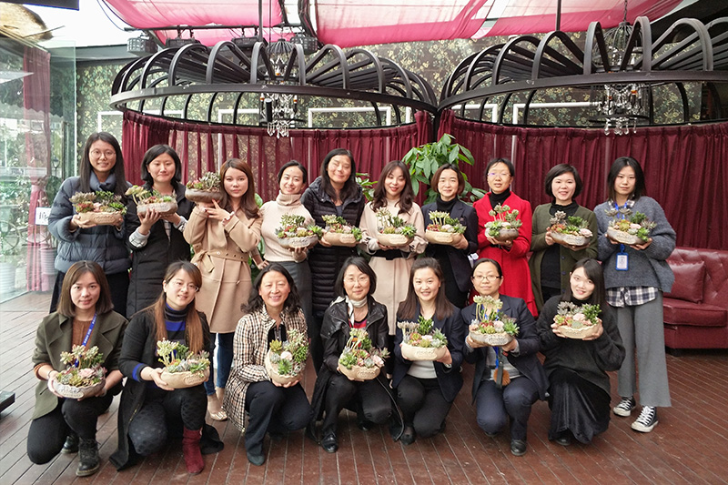 随后,园艺老师向大家介绍了多肉植物的类别品种、形态特征、栽培方法以及微景观的艺术设计与赏鉴。在体验环节,面对一棵棵萌态可掬的“小鲜肉”,栩栩如生的小摆饰,精美别致的花盆,大家兴奋不已,跃跃欲试。工作中干练的女汉子变成了心灵手巧的园艺师,她们小心翼翼地将娇柔的植物安入花内,铺上彩色石子,放上小饰品,每个人都发挥着丰富的想象和新奇的创意,一座座“迷你小花园”各具特色,极富设计感。大家纷纷拿出手机拍下作品,记录下活动的美好瞬间。喜欢养花的姐妹们还向老师请教花卉种植和养护知识,每个人的脸上都洋溢着轻松和愉悦。