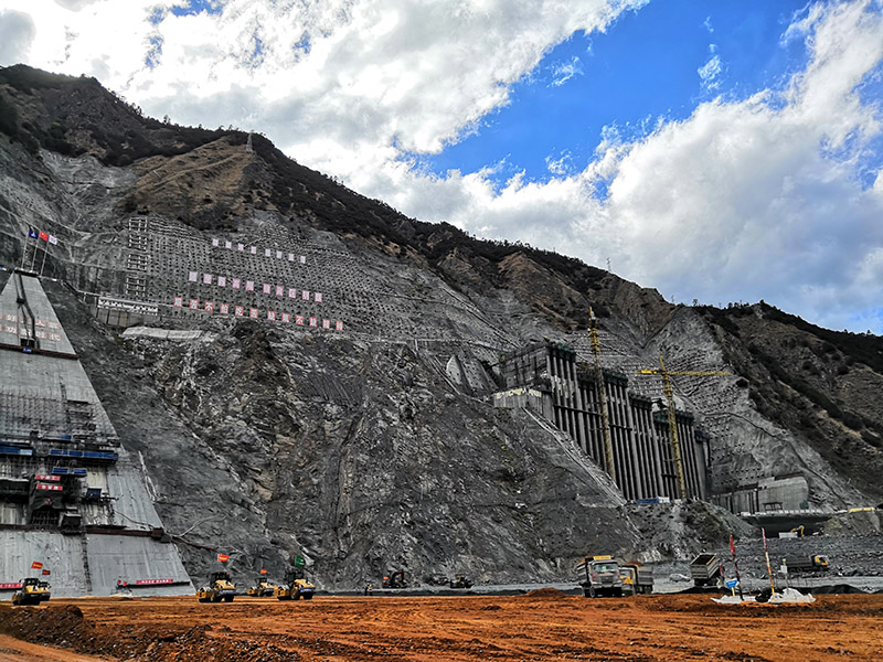 目前,正值两河口电站工程建设的重要时期,到处都是热火朝天的劳动画面。上百家参建单位、2万多名建设者挥洒“艰苦不怕吃苦、缺氧不缺精神”的豪迈情怀,克服“五高六大两长”难点和高寒海拔恶劣自然环境、复杂的建设环境等不利条件,工程建设实现一个又一个里程碑目标。在高土石坝,上百台推土机在工地上忙碌穿梭,建设者们忙碌的身影和机械的隆隆声交织回荡在高山峡谷中,这座世界第3高坝正日益成型;在两岸岩壁上,为了在200层楼高的几乎垂直的岩壁中固定15000根锚索,党员带头冲锋在前,硬是将一根根的锚索肩扛手提抬了上去;在地下厂房,建设者们克服潮湿昏暗、温差变化大的不利条件,昼夜不停精心安装硕大无比的发电装置,工地上随处可见一面面党员突击队、青年突击队火红的旗帜迎风飘扬,成为一道道亮丽的风景线。