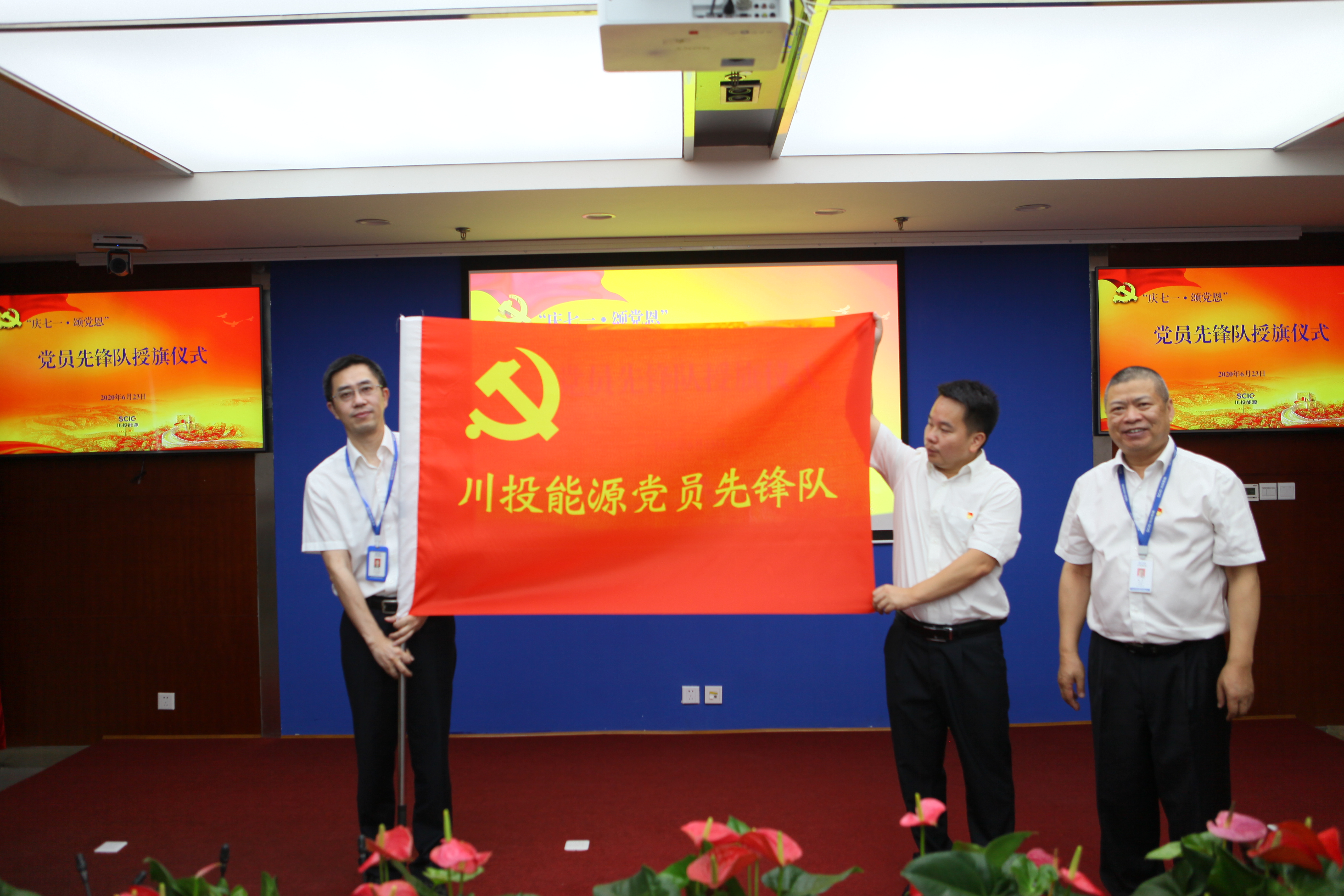 杨洪书记为党员先锋队进行授旗,并号召全体党员不忘初心、牢记使命,坚守岗位,忠诚履职,越是艰险越向前,彰显共产党员先进性。党员先锋队要带头执行纪律,展现党员风采,为打造“一流能源上市公司”贡献力量。