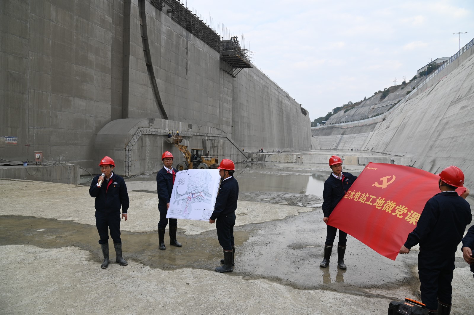 在导流明渠基坑里,徐孝刚书记为大家讲授了一堂别开生面的工地微党课。他讲到,今天站在已浇筑完成的导流明渠基坑,大家都应倍感自豪,今天也是最后一次在导流明渠基坑里开展微党课。再过两天,我们的导流明渠就要过流了,回顾导流明渠施工的一年多时间里,我们克服了新冠疫情影响、征地拆迁滞后、边坡地质条件差、砂石骨料短缺等重重困难,今天的成果来之不易,靠的是全体参建单位、全体员工的共同努力,今天在这里要再向大家道一声感谢,正是你们的艰苦付出和无私奉献,才取得了我们今天的骄人成绩。徐孝刚还对照图纸和现场的施工实体,再次向大家普及了纵向围堰、消力池、正常蓄水位、死水位等水电站施工的基础知识,向大家讲解了银江水电站岩埂拆除、大江截流、检修闸门和三期挡水发电等重点知识。徐孝刚强调,按期保质保量推进工程进度是我们的“初心”,把银江水电站建设成为“精品工程、样板工程、阳光工程”是我们的“使命”。在这最关键的时期,大家要再接再厉,保持紧张有序,做到万全准备,严把各个关口,确保导流明渠过流和大江截流的按期顺利实现,用最优异的成绩为2021年画上圆满句号,为建党百年献上银江贺礼。