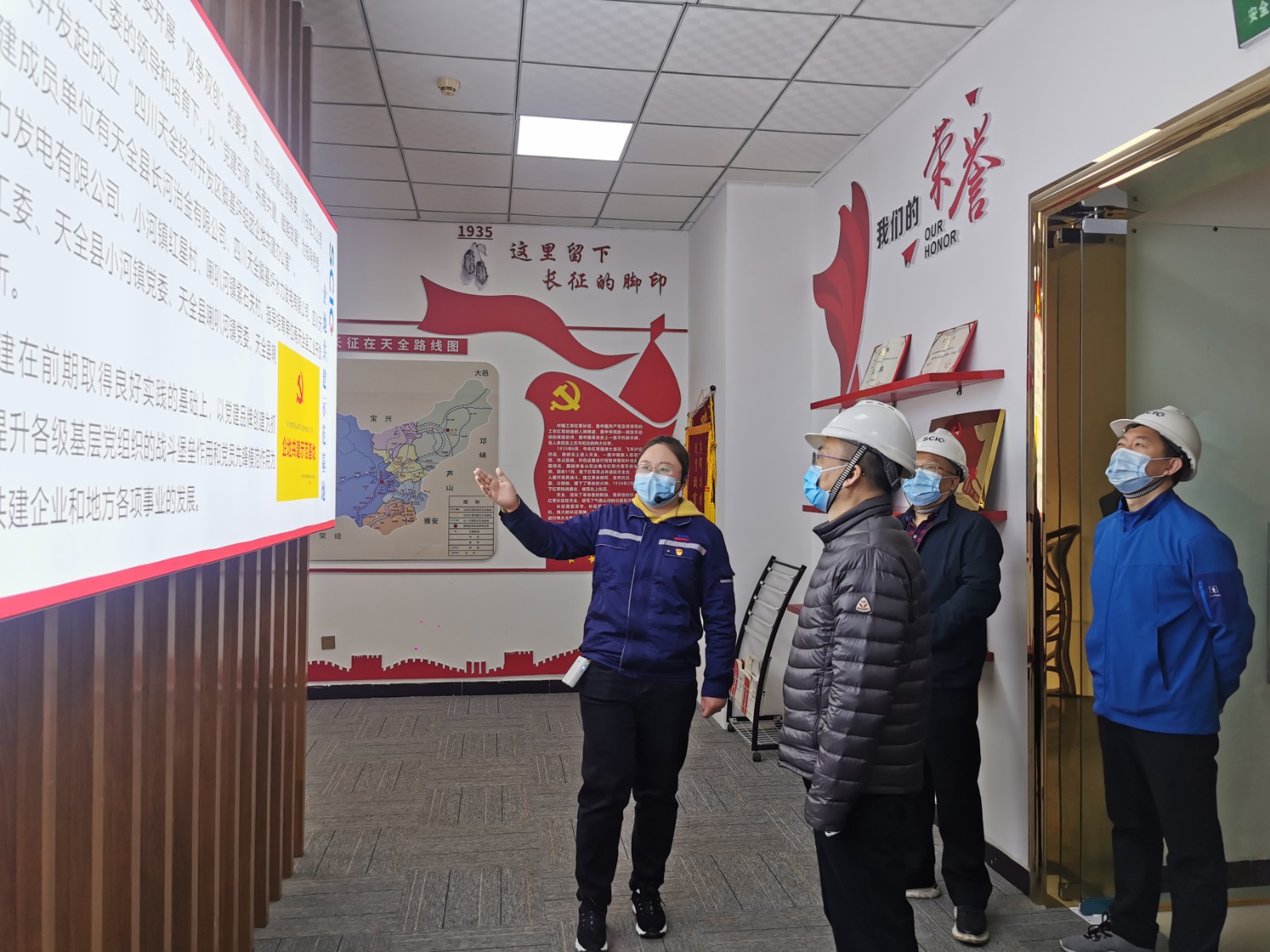 在天全河流域所属脚基坪电厂热火朝天的2号机组A级机组检修现场,孙前元一行听取了脚基坪电厂自主检修组织机构、检修安全管理、检修现场施工情况等方面情况的汇报;随后,到脚基坪电厂“企地共建示范基地”党建室进行参观。