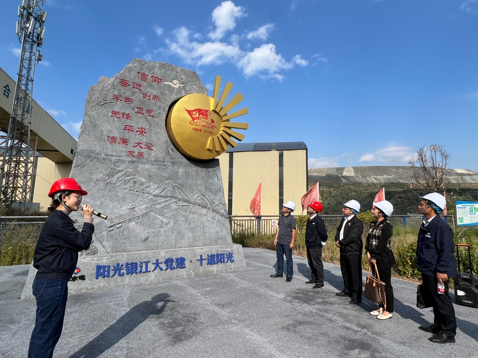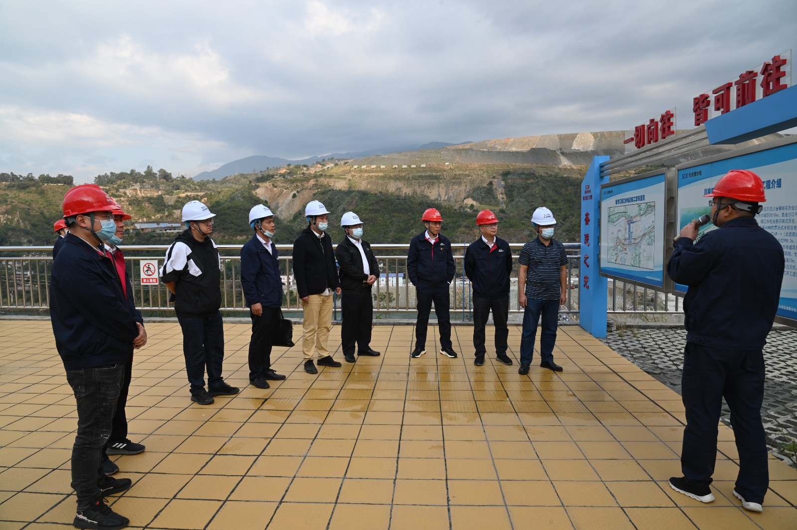 覃凤荏一行首先来到银江水电站施工现场,参加了银江水电站大坝首仓混凝土浇筑活动。在现场听取了银江水电站工程整体规划、建设意义、工期计划等基本情况介绍,并参观了钢筋加工车间、试验室等地。随后,覃凤荏一行参观了攀水电公司“七色阳光大党建”宣传阵地,详细了解了“十道阳光行动计划”等内容。
