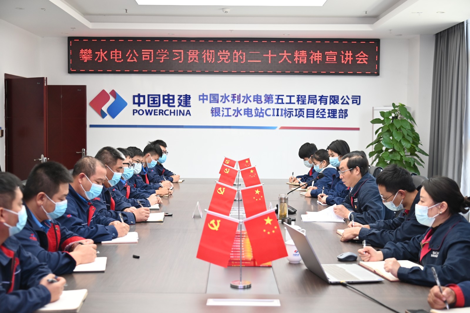 在宣讲前,徐孝刚深入银江水电站厂房和大坝基坑施工现场进行了检查调研,详细了解目前的施工进度及下步施工安排,并立即组织公司相关部门和设计、监理等单位现场研究,及时解决存在的困难,确保银江水电站顺利施工。现场调研完后,徐孝刚立即前往水电五局银江项目党支部进行了党的二十精神大专题宣讲,主要从5个深刻领会以及坚定推动党的二十大决策部署在攀水电公司、攀新能源公司落地见效等6个方面进行了深入浅出的讲解。