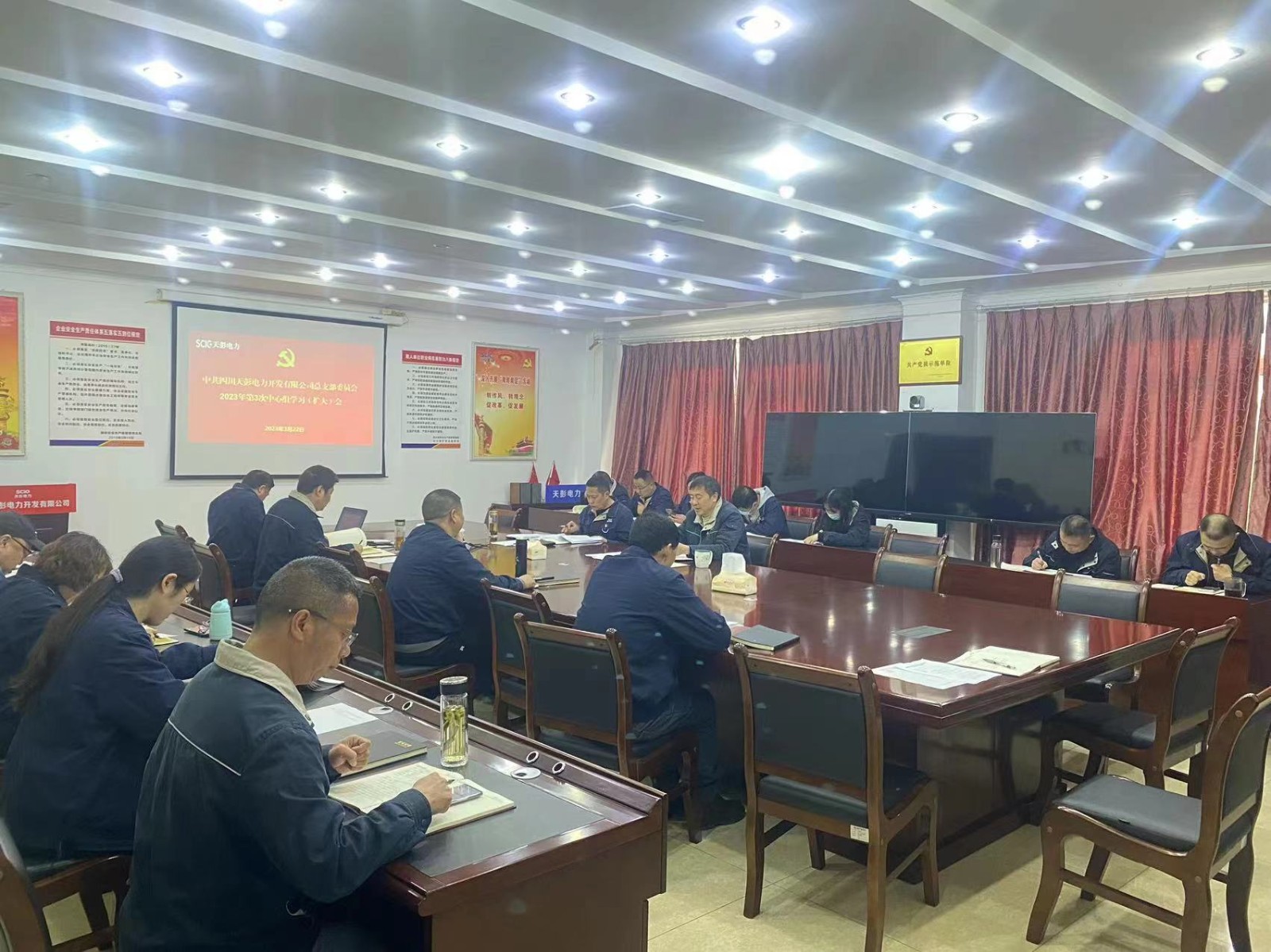 3月22日上午,川投电力党委所属天彭电力党总支召开2023年第3次党总支理论中心组学习会,专题学习研讨全国两会精神。公司领导、党员干部、关键岗位人员参加会议,会议由公司党总支书记、总经理刘红兵主持。