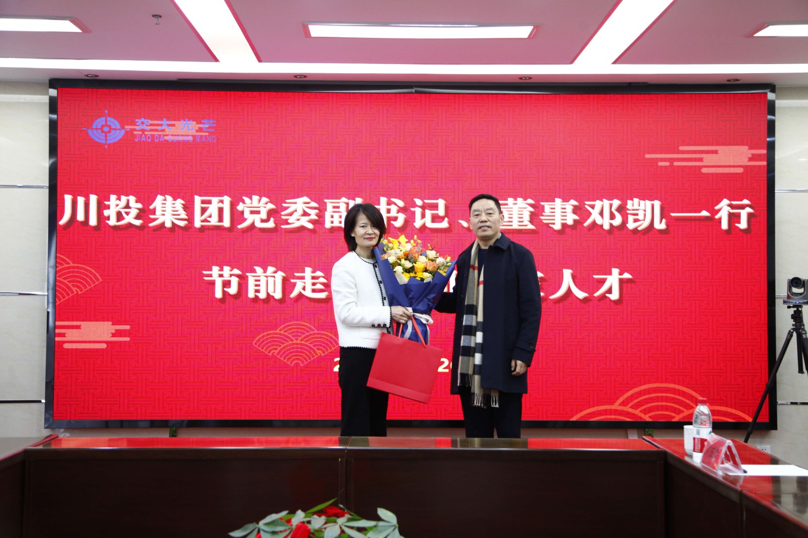 邓凯对易倍体育 专家代表、轨道交通供电综合监控行业知名专家、四川省杰出人才、交大光芒首席专家陈奇志进行慰问,并送上鲜花,关切询问了陈奇志的工作近况,鼓励其持续紧抓国家科技强国和创新驱动发展战略的时代机遇,带领团队不断取得科技创新新成果。邓凯同时指出,交大光芒要抢抓战略机遇,紧跟政策方向,尤其要坚定发展信心,加大研发投入力度和人才的引进培养力度,加快成果转化速度,打牢企业创新基础,努力融入高质量发展大局,为国家轨道交通事业做出新的更大贡献。
