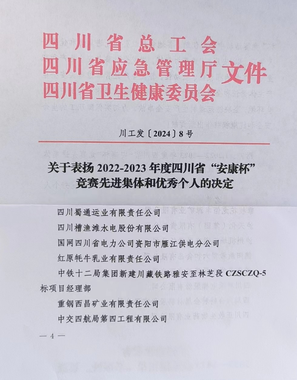 近日,四川省总工会、四川省应急管理厅、四川省卫生健康委员会联合印发《关于表彰2022-2023年度四川省“安康杯”竞赛先进集体和优秀个人的决定》,四川槽渔滩水电股份有限公司(简称“槽渔滩公司”)荣获四川省“安康杯”竞赛优胜单位荣誉称号。