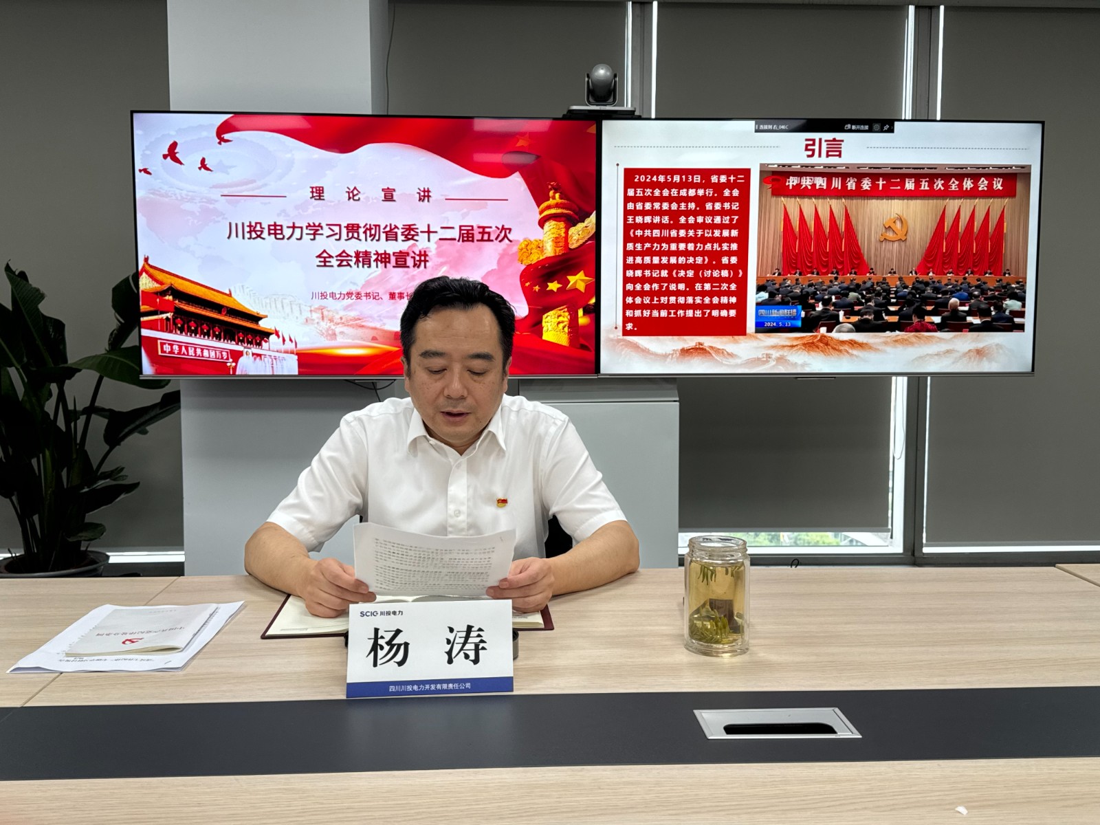 会上,杨涛围绕省委十二届五次全会的总体要求、精神实质、贯彻落实等方面进行了重点宣讲。他强调,要准确理解把握省委十二届五次全会各项决策部署的战略考量和目标任务,将学习宣传贯彻全会精神作为当前和今后一个时期的重要政治任务,引导党员干部准确把握其中的丰富内涵和核心要义,切实把思想和行动统一到省委的决策部署上来。党员干部要坚持学以致用,把学习省委十二届五次全会精神同学习习近平总书记关于发展新质生产力的重要论述结合起来,紧密联系公司实际,找准贯彻落实的切入点,确保全会精神在川投电力落地生根、见行见效。