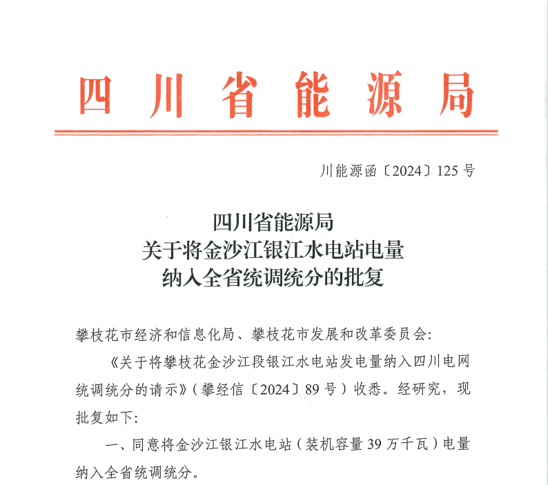 8月27日,在四川省能源局、攀枝花市有关部门和易倍体育 的指导帮助下,经过积极对接、多方协调,攀水电公司成功取得四川省能源局将银江水电站电量纳入全省统调统分的批复,为实现银江水电站2024年首台机组投产发电目标再增“助推器”。