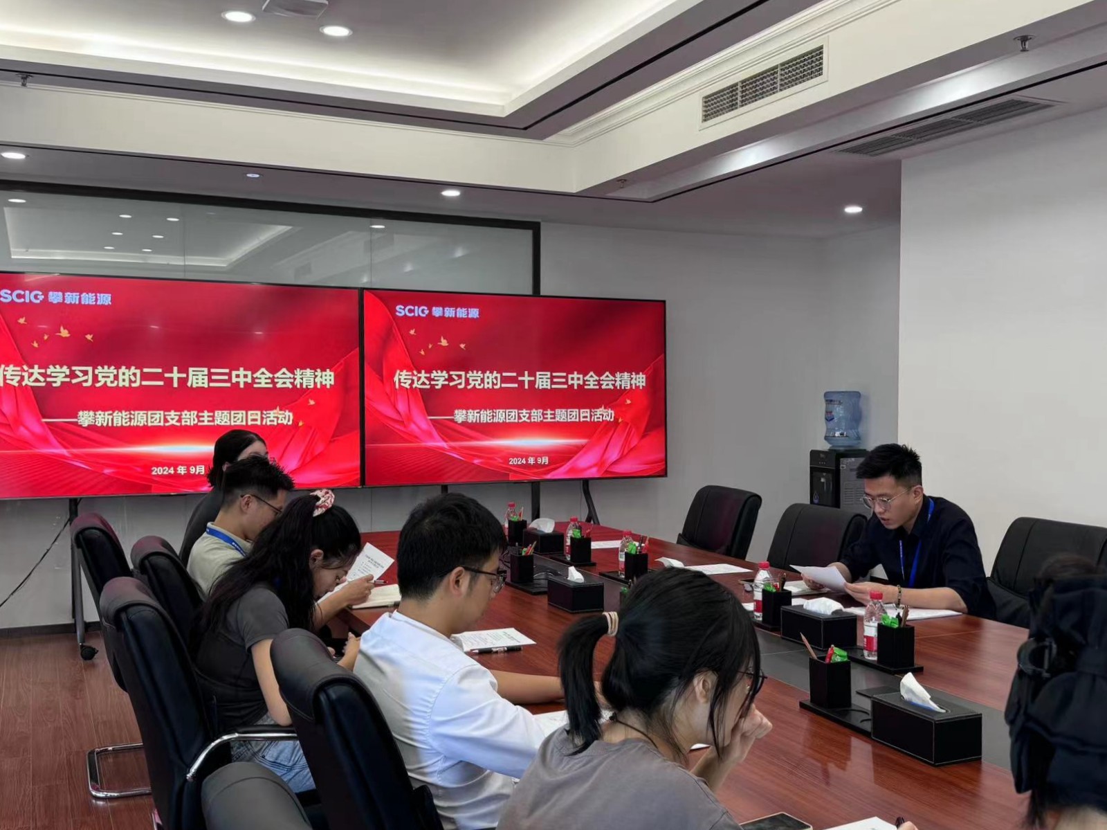 近日,攀新能源公司团支部在川投大厦707会议室举行2024年9月主题团日活动,专题传达学习《中国共产党第二十届中央委员会第三次全体会议公报》,学习贯彻党的二十届三中全会精神。攀新能源团支部书记、经营管理部经理潘鑫主持并领学,公司全体团员及屏山抽蓄公司全体团员参会。