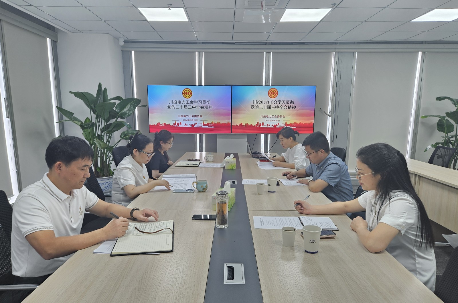 按公司党委统筹安排和相关要求,为深入学习宣传贯彻党的二十届三中全会精神,推动全会精神落地落实,9月20日,川投电力工会召开会议,专题传达学习党的二十届三中全会精神。会议由公司党委副书记、工会主席杨鑫主持,工会委员及相关成员参加学习。