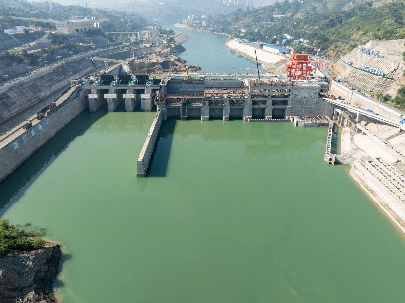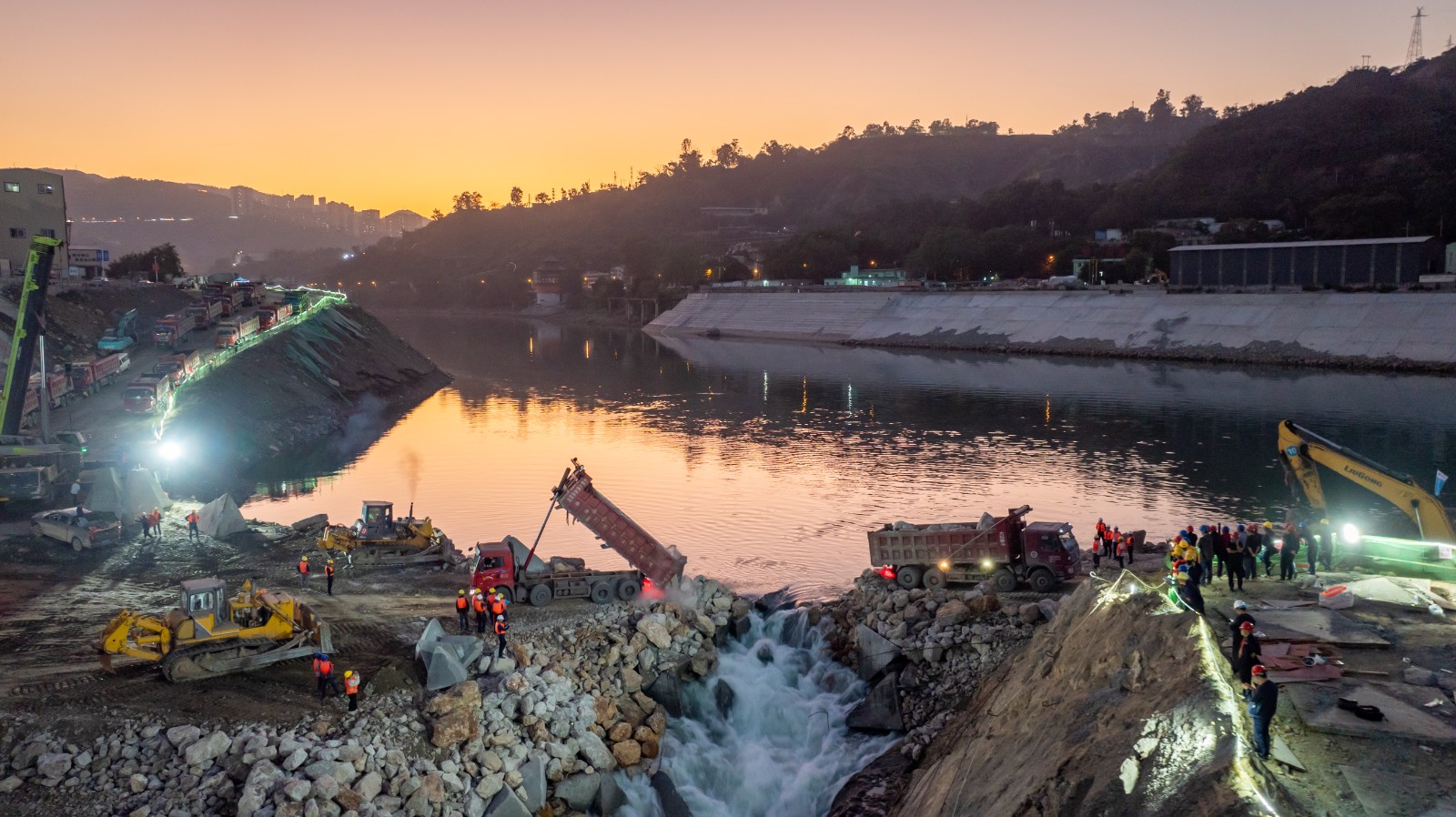 18日中午起,银江水电站导流明渠开始全面截流进占,百余辆自卸车将石料抛投进戗堤龙口,导流明渠过流通道缓缓关闭,金沙江水全部从溢流坝段流向下游,成功实现了导流明渠截流合龙,打赢了银江水电站蓄水发电阶段“五大战役”中具有里程碑意义的第二战,向着首台机组发电目标又迈进了重要一步。