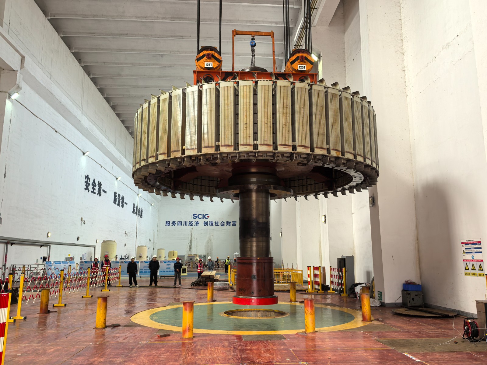 近日,经过自主检修团队的连续奋战,川投电力所属百花滩电厂2号发电机组转子顺利吊出,标志着此次检修工作首个重大关键节点取得阶段性胜利。川投电力党委委员、副总经理王伟,副总经理陈云明及相关部门负责人现场指导工作。