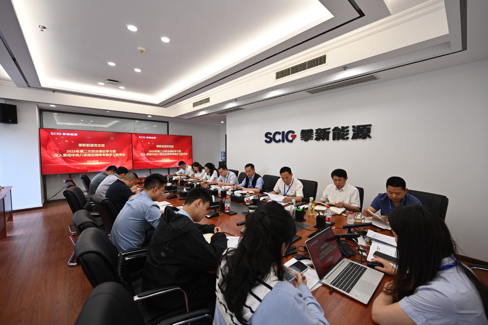 4月27日,攀新能源党支部召开2025年第二次政治理论学习(扩大)会暨深入贯彻中央八项规定精神专题学习会,党支部书记、董事长主持会议,领导班子成员及全体党员参加。