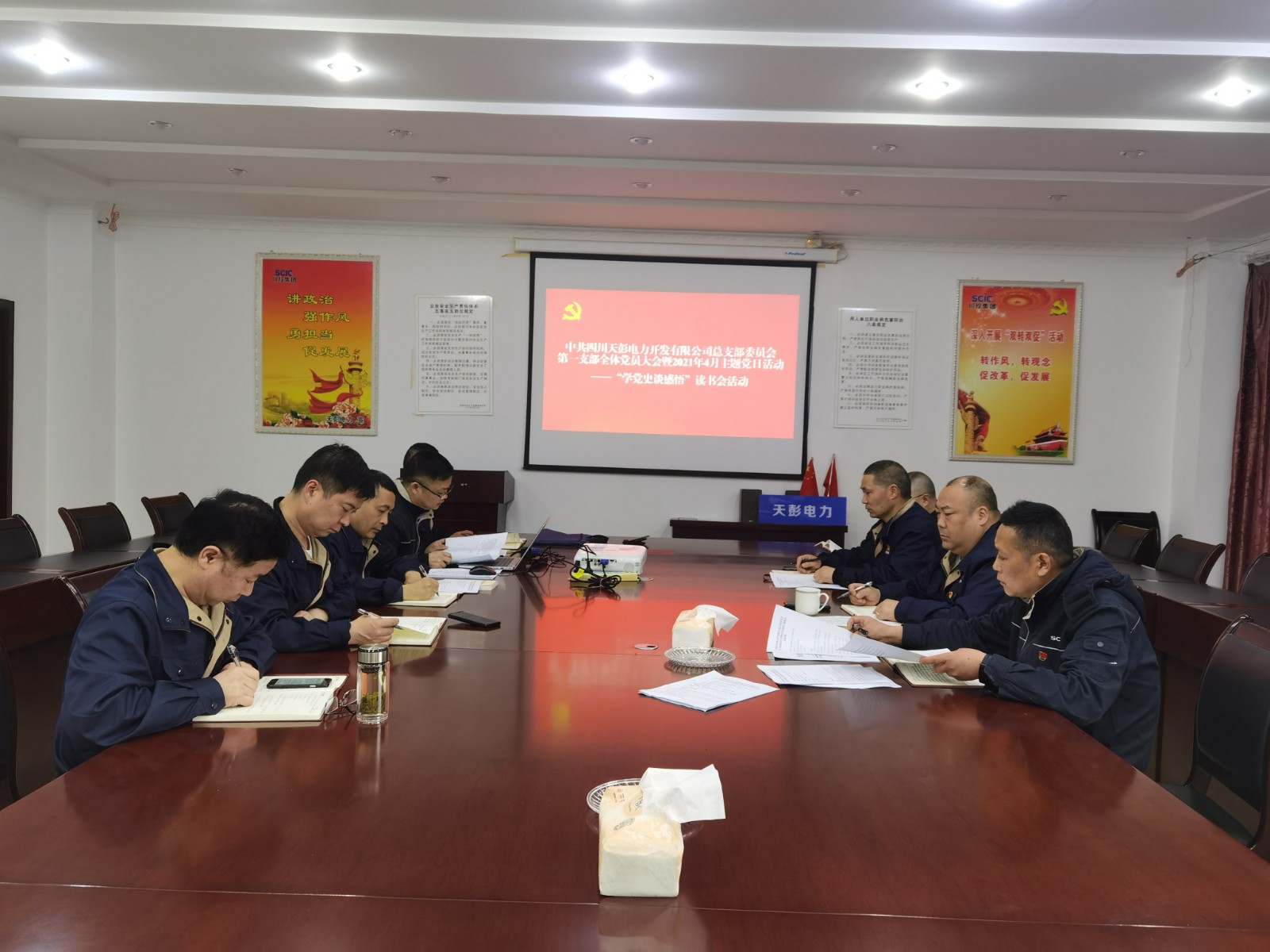 4月29日上午,天彭电力党总支在公司二楼会议室召开2021年第4次中心组学习(扩大)会暨党史学习教育专题读书会,公司领导、各支部书记参加会议,会议由党总支书记、总经理陈忠主持。