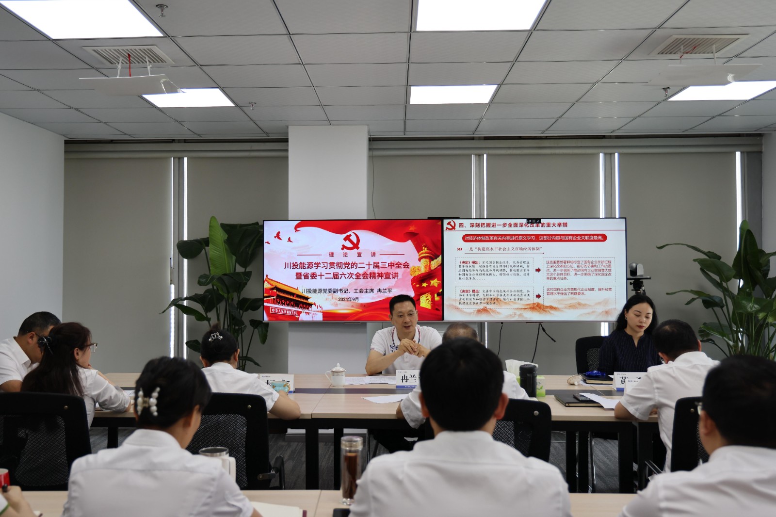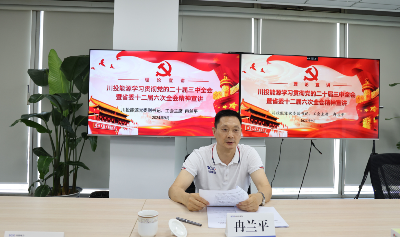 9月26日,易倍体育 党委副书记、工会主席冉兰平赴川投电力公司专题宣讲党的二十届三中全会精神和省委十二届六次全会精神,为进一步全面深化改革凝心聚力。川投电力党委副书记、总经理蔡承德主持会议。